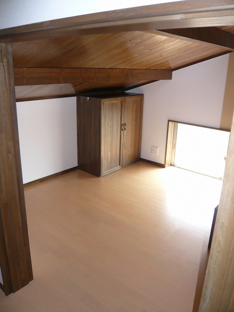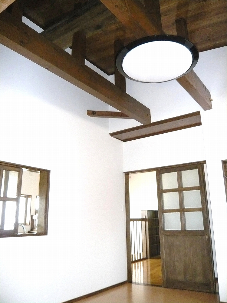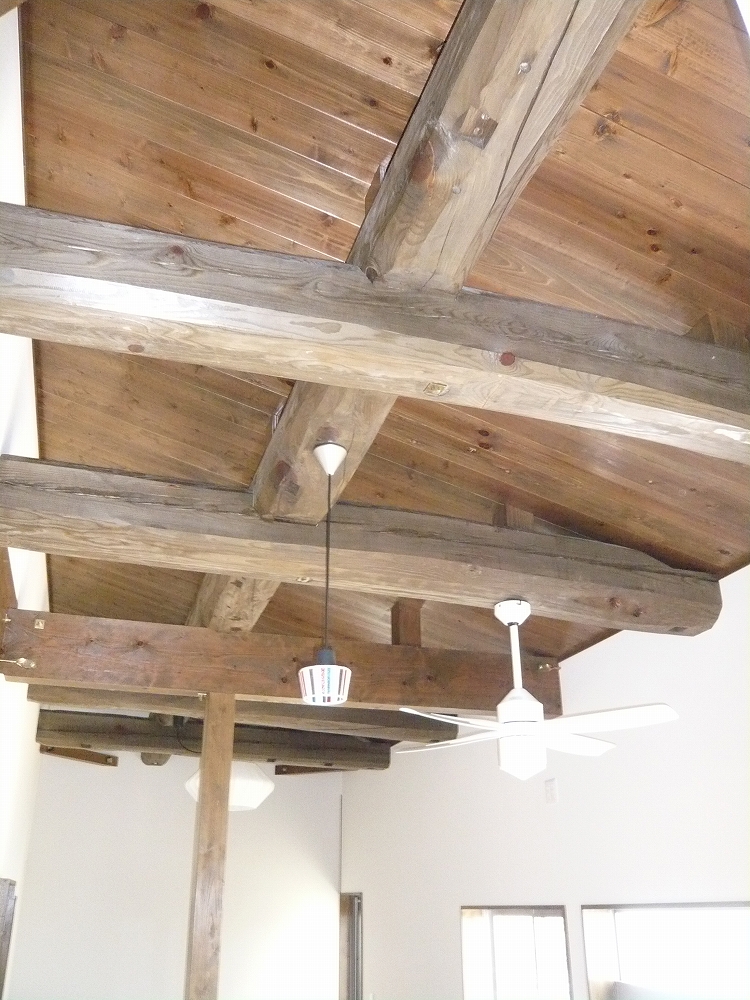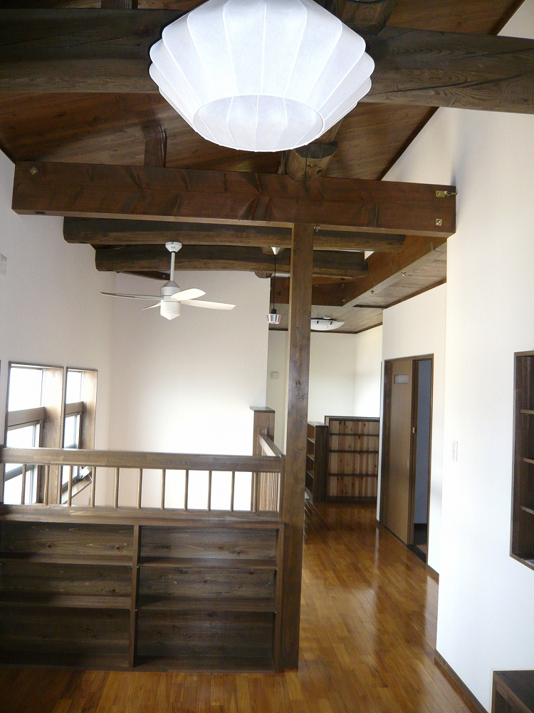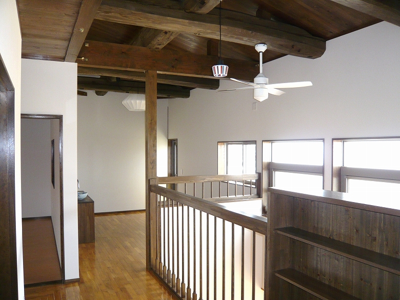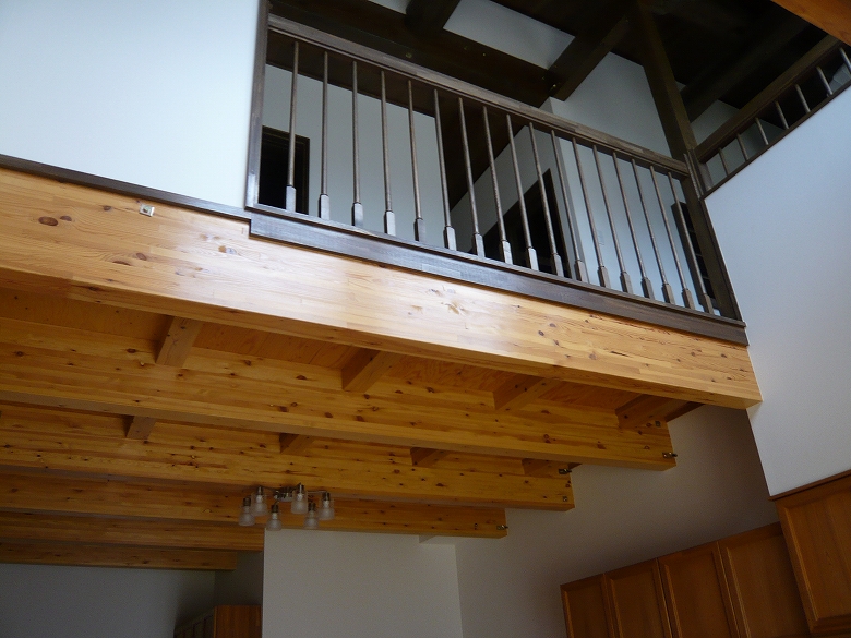 吹き抜け部分には、丸太の軸組が下からも見える様に仕上げてあります。