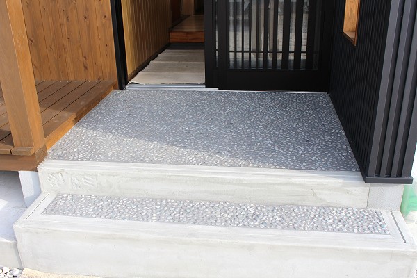 玄関ポーチは、洗い出しにして家族の手形を付けました。