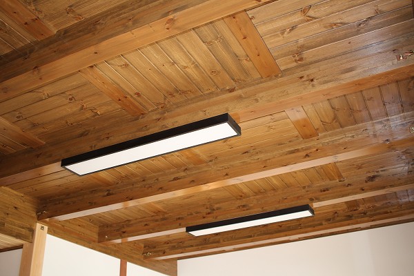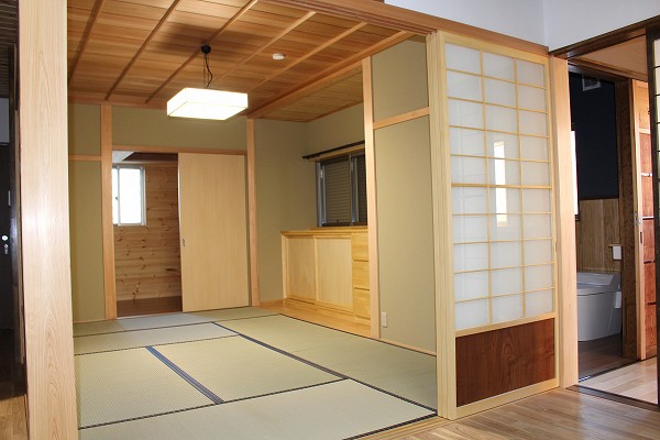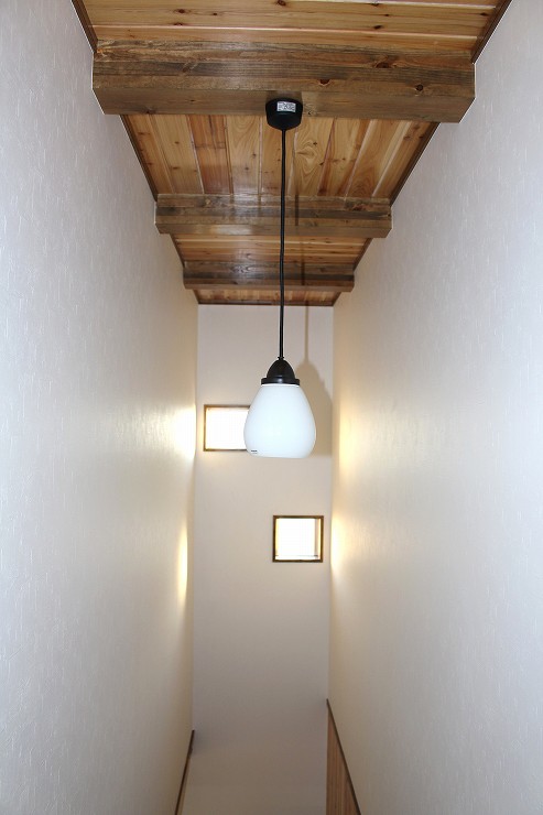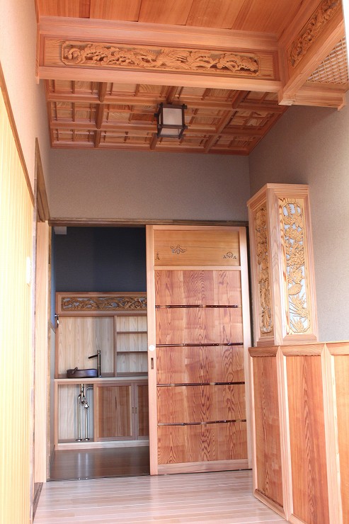 玄関を開けると格天井や間接照明、杉板戸など旅館のような雰囲気に仕上げてあります。