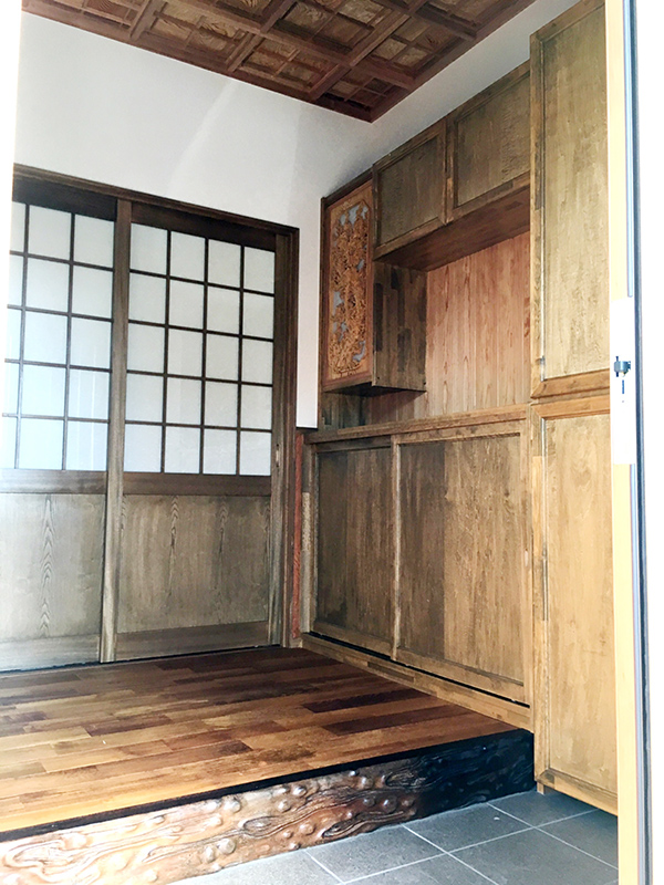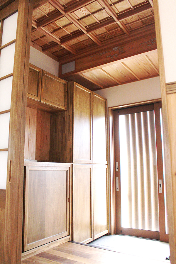 玄関の天井は杉の格天井・柾目板・欄間、框は唐木三大名木のタガヤサン、欄間から灯りが溢れる玄関収納、カリンのフローリングで仕上げています。