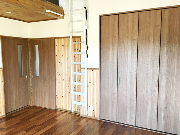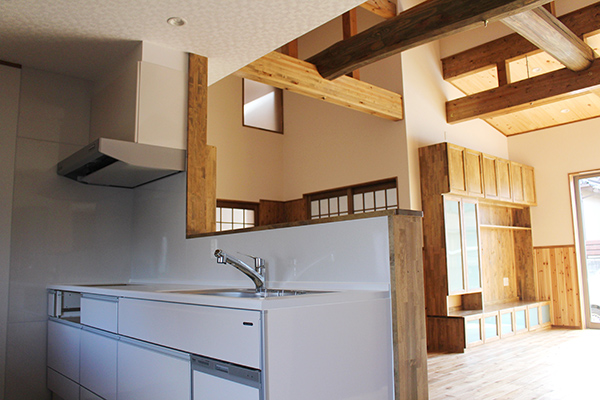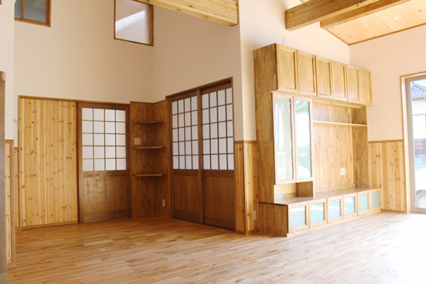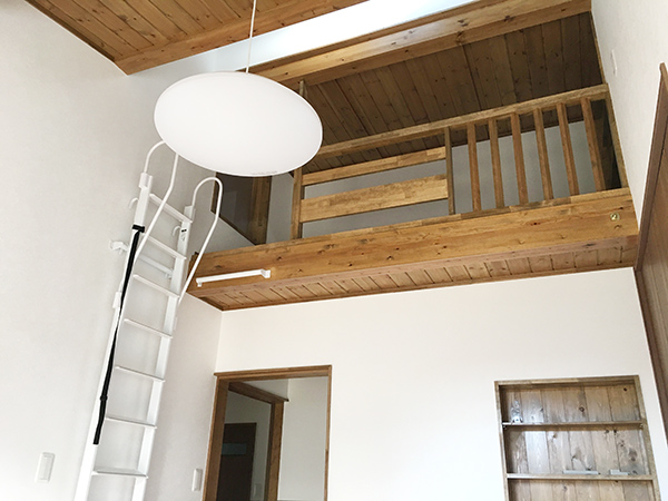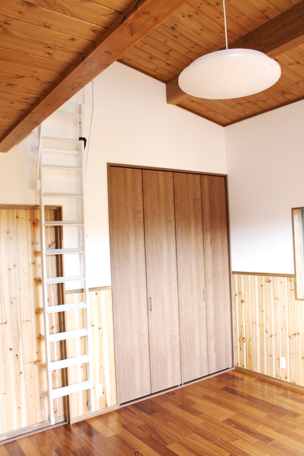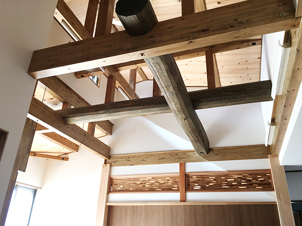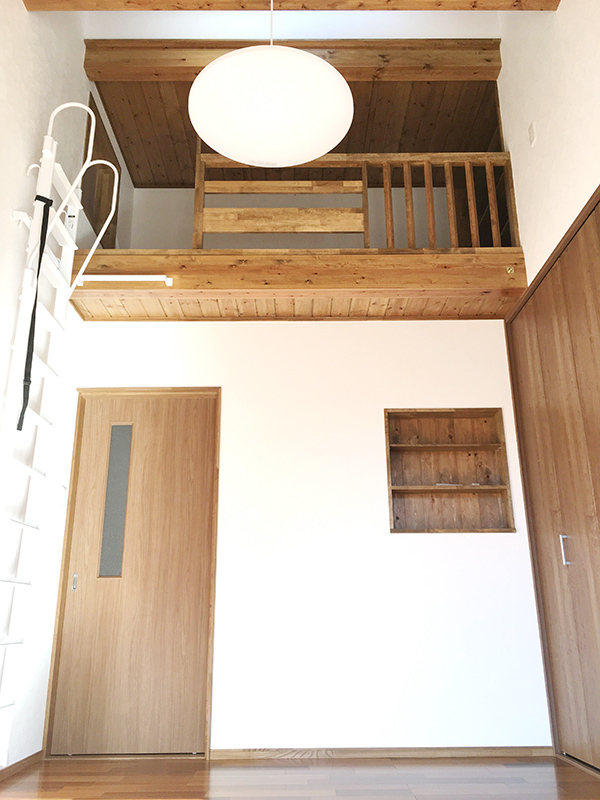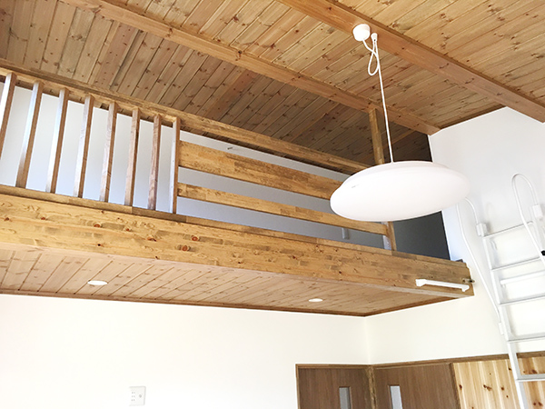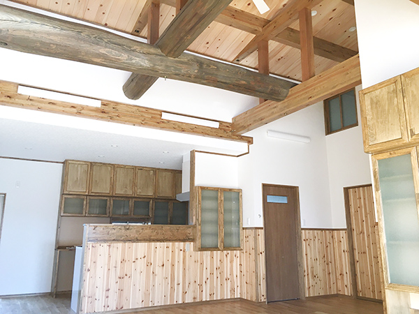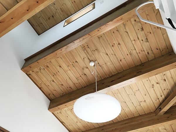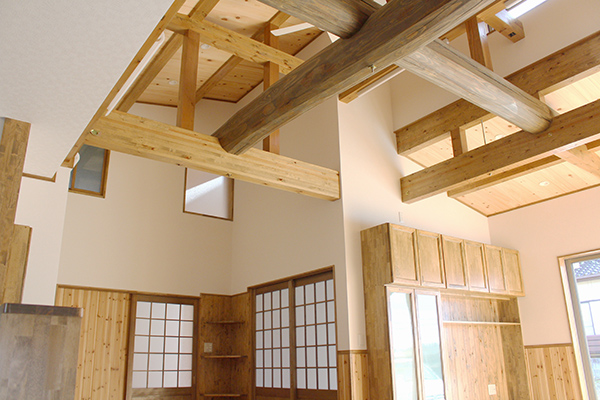 LDKの天井は、丸太と梁が見える開放的な空間で隣の部屋のロフトからお子さんが引き戸を開けてリビングが見えるようにしてあります。