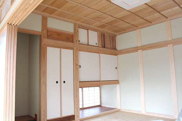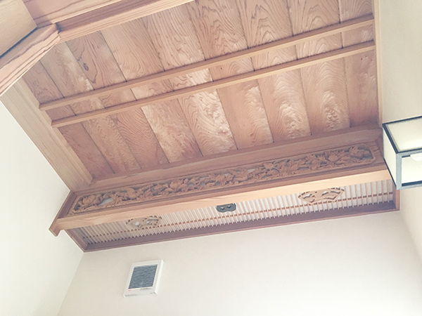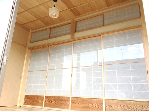 和室・縁側の天井は猿頬天井で建具に杉の木目板をはめ込んであります。
