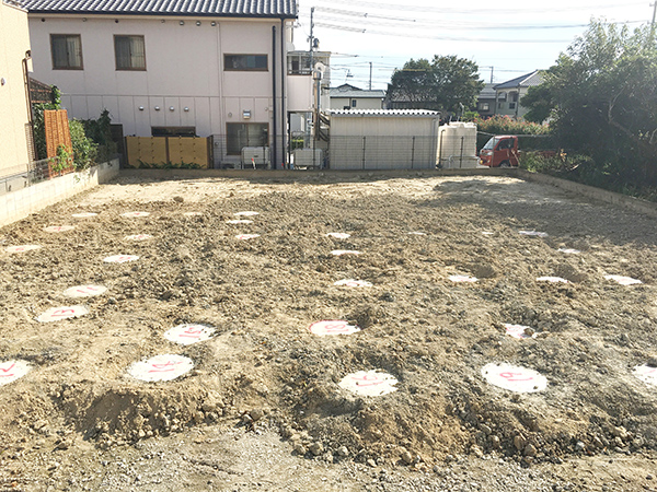 地盤調査の結果、軟弱地盤だったので柱状改良から始まりました。