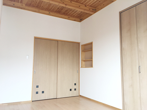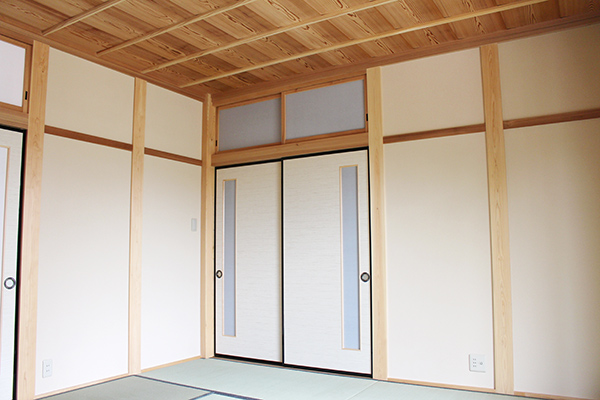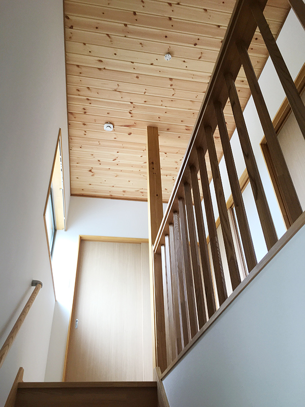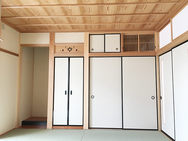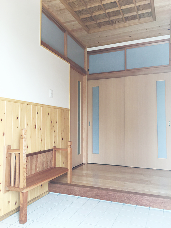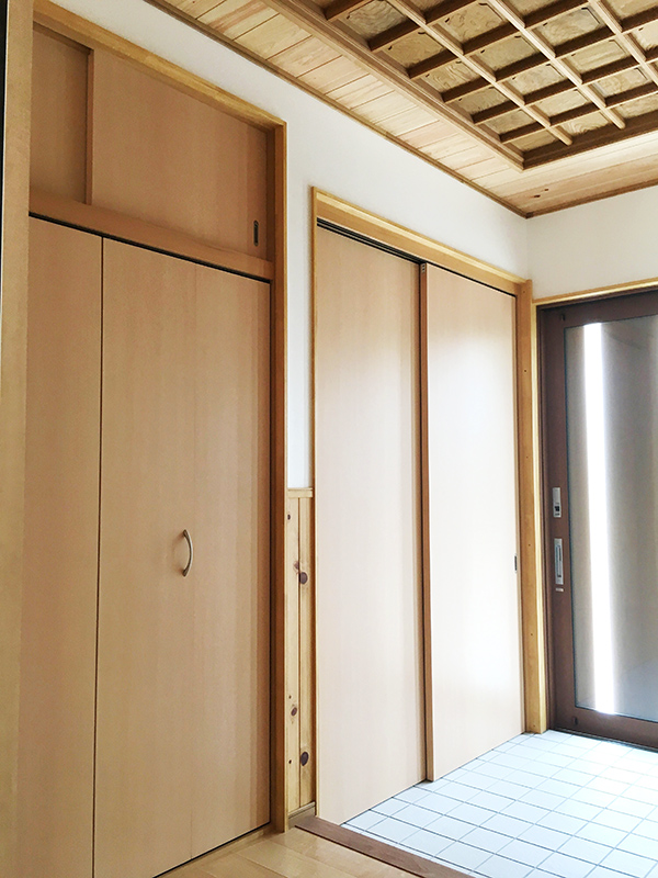 お客様から『和室以外、洋風建築が良いですが、玄関だけ少し和風を取り入れてください。』とご依頼され、弊社得意の格天井ではなくあっさりとした格天井を取り付けました。