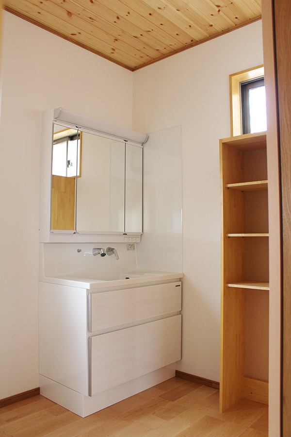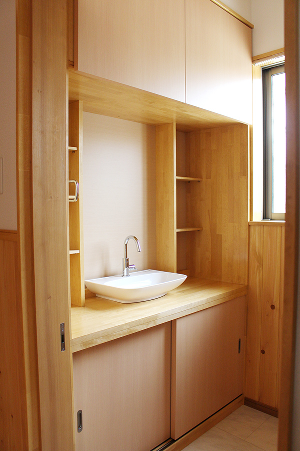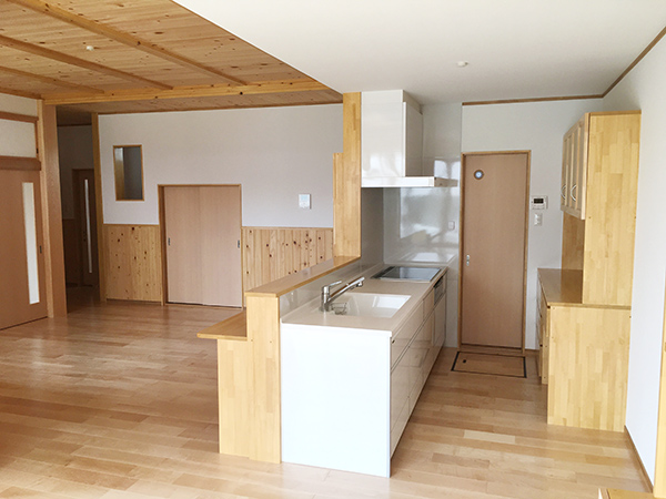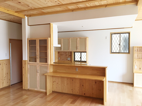 奥様のこだわりが詰まったキッチン・洗面・トイレ収納、カウンター、テレビボードや洗濯物を干すためのウッドデッキ。
