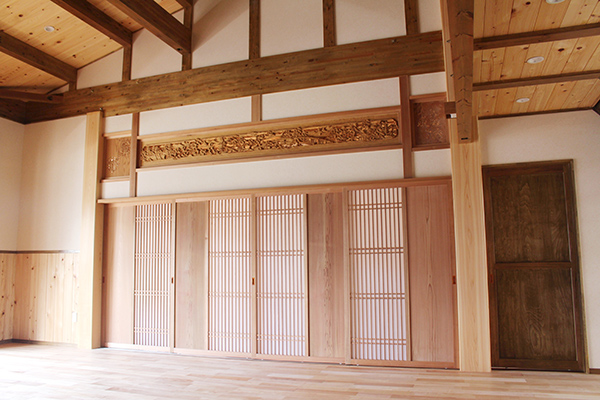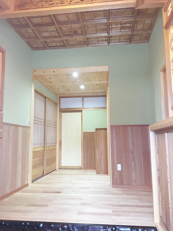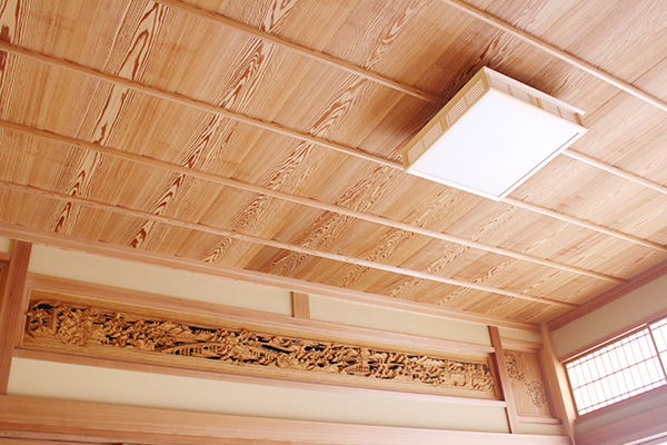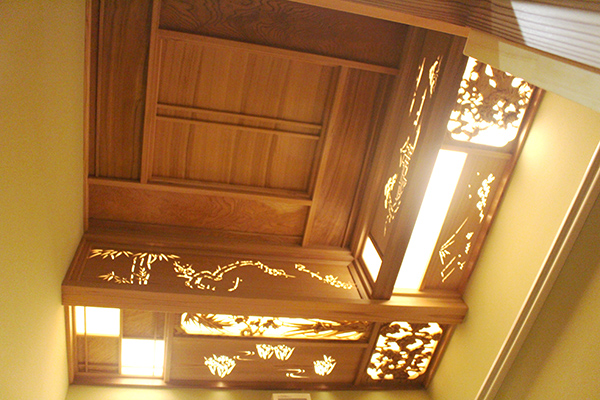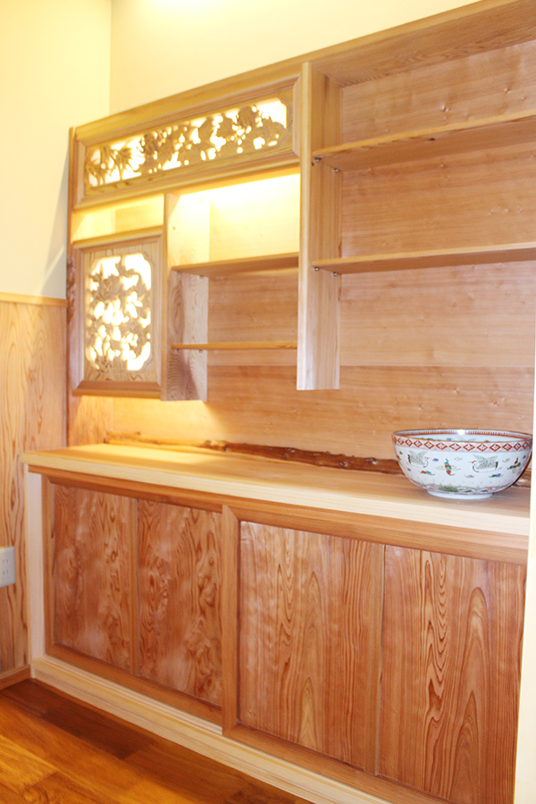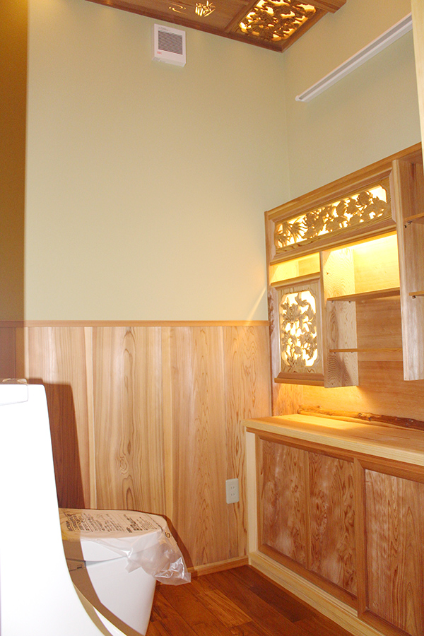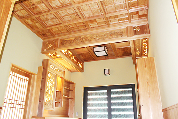玄関・トイレは、格天井と杉の柾目板・欄間などで製作した天井と杉板・欄間で製作した収納を。