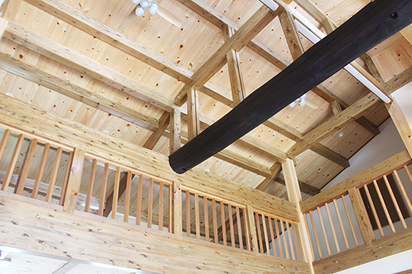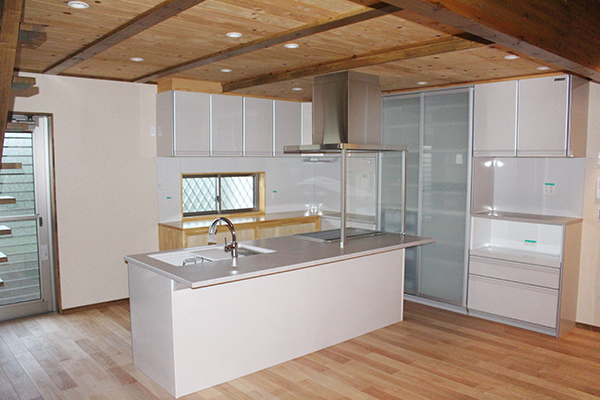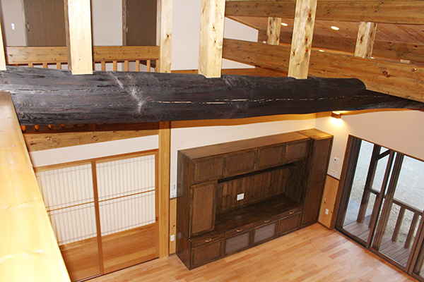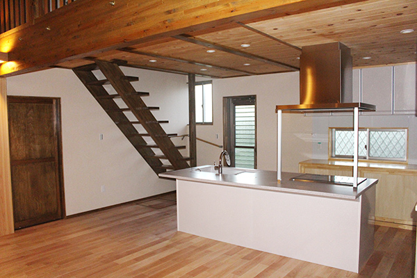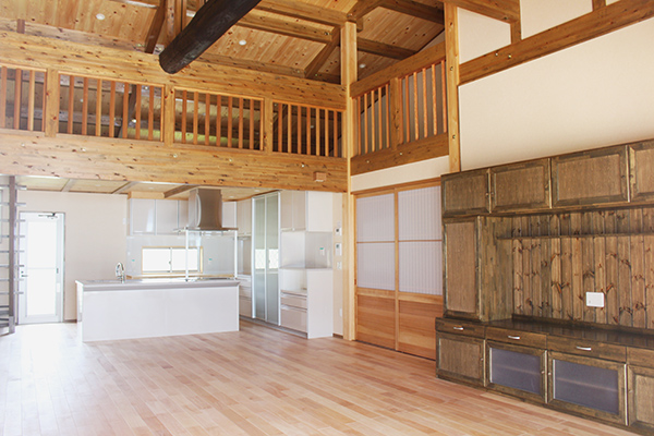 LDKは、お母様がショールームでお選びになったこだわりのキッチンとカップボード、スケルトン階段からの中二階、丸太や和室の欄間・建具を見せて古民家風に仕上げてあります。