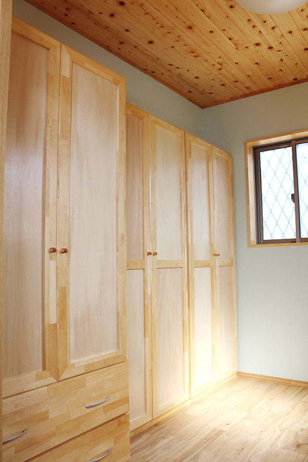 洗面、ウォークインクロゼットには、お客様の下絵を元に製作をした壁面収納をたくさん取り付けました。