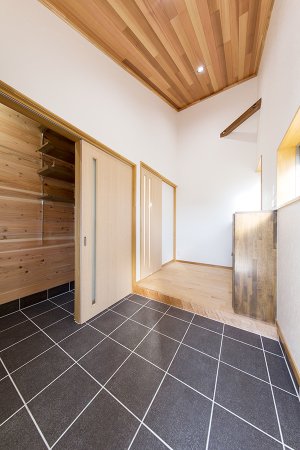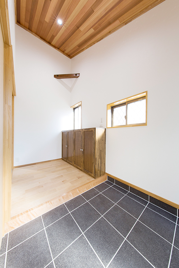 玄関を入ると高い斜めのウエスタンレッドシダーの天井、土間収納、下駄箱があります。