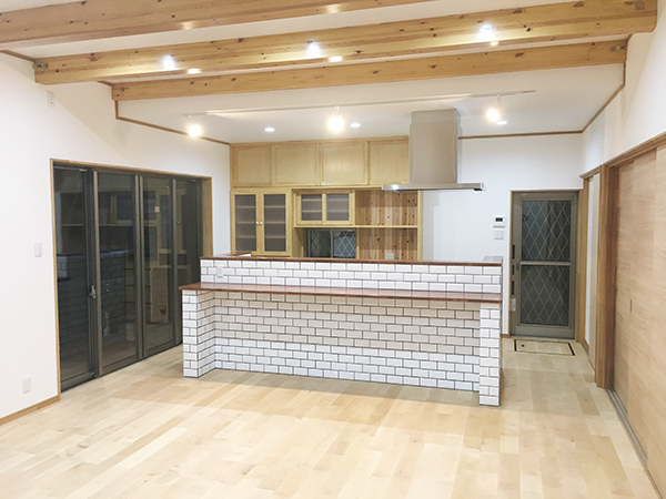 LDKは、奥様がこだわって選んだタイルをキッチンに合わせたカウンターを造り、左官屋さんに張ってもらいました。
