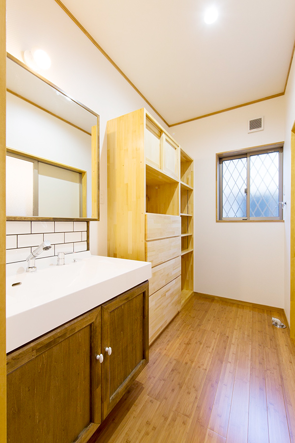 カップボード・テレビボード・洗面台・洗面収納は、お客様の下絵を元に製作して取り付けました。