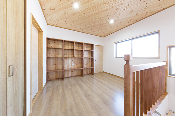 2階の階段を上がると大きなホールに本棚を取り付け、ご家族が団欒できるスペースにしてあり、寝室の奥にはウォークインクロゼットを設け、たくさん収納ができるようになっています。