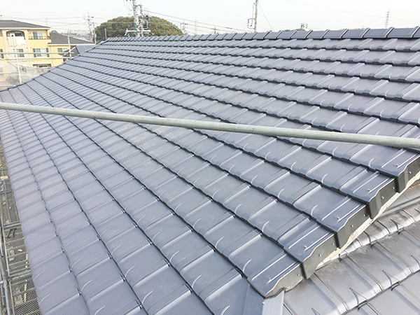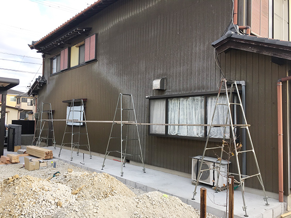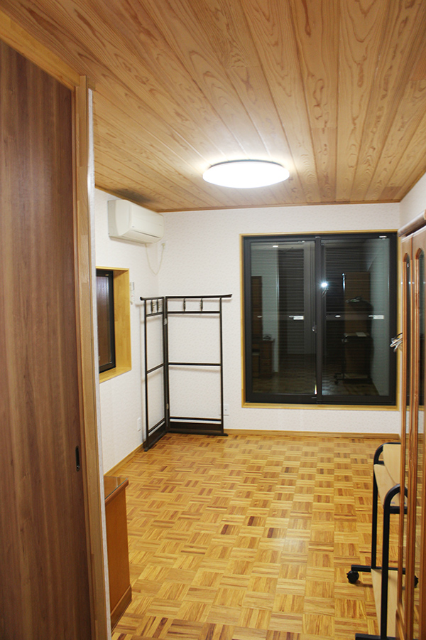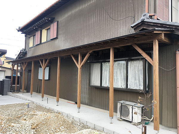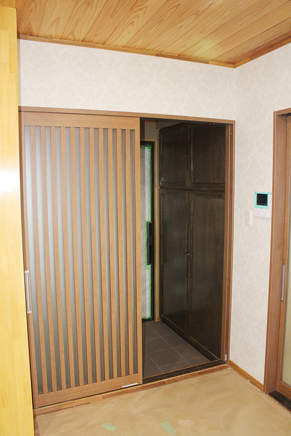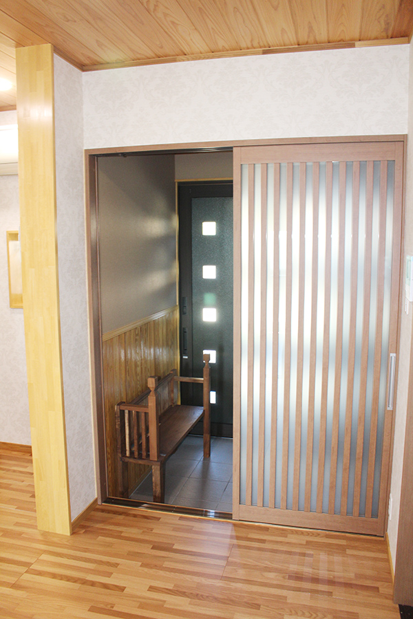外部は、屋根瓦の葺き替え・玄関の増築(1坪)・柱を立て軒先を伸ばし玄関の屋根兼庇・全サッシの交換、新たにサッシ取り付け・トタンをめくりサイディングに張り替えをしました。