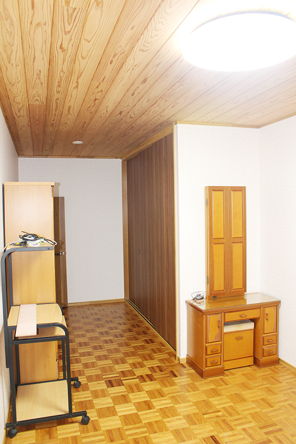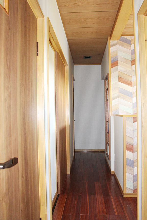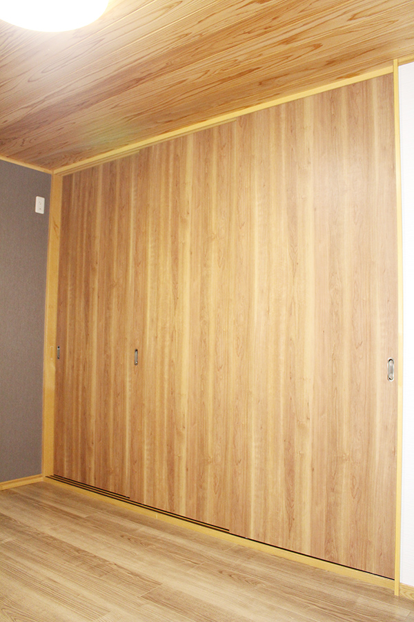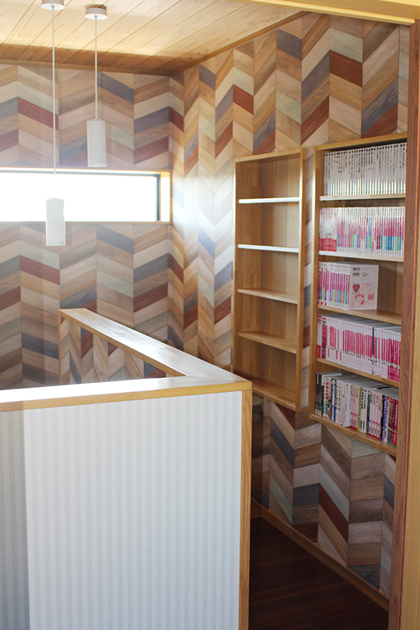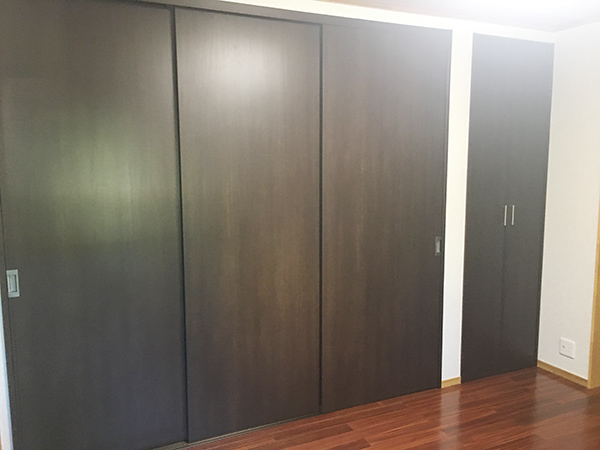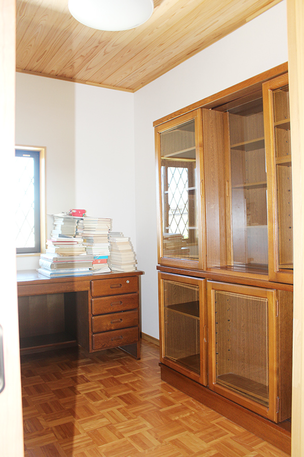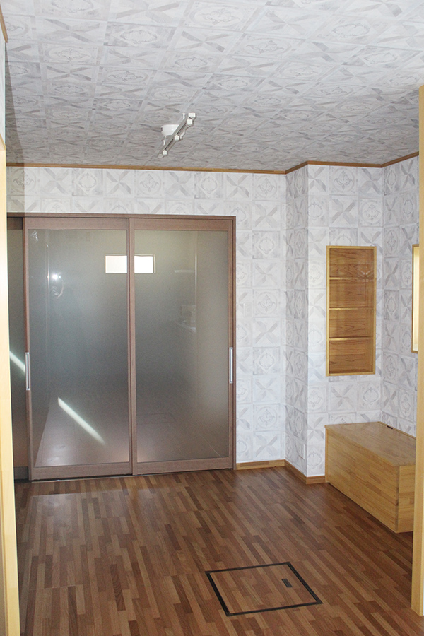 ガレージだった場所をキッチンに、玄関だった場所に新たに階段を取り付け勝手口とクロゼットに、キッチンをウォークインクロゼット、それ以外のお部屋は間取りはそのままで床・クロスの張り替え、テレビボード・カップポード・本棚など下絵を元に製作し取り付けました。