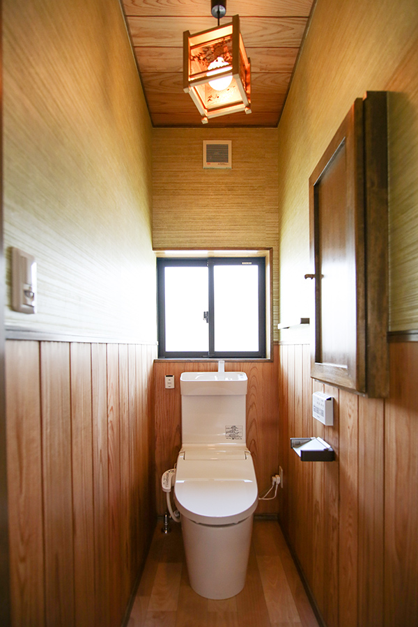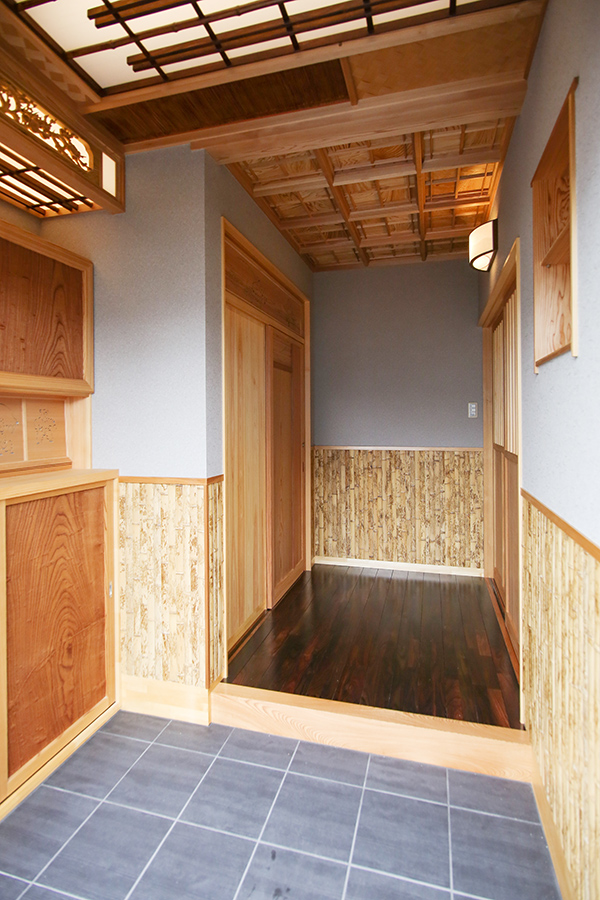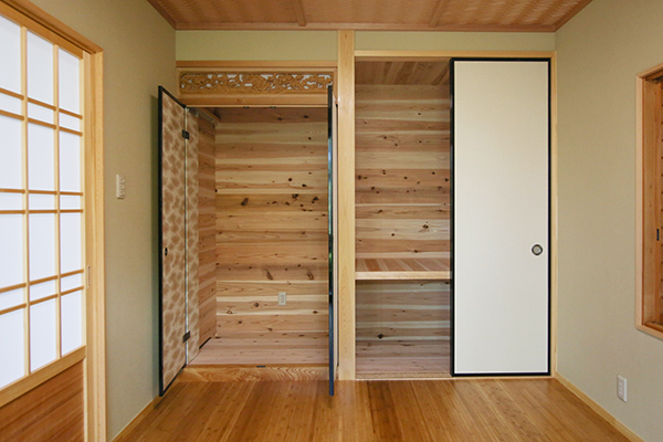 玄関・トイレ収納は、お任せということで、杉と欄間で製作させて頂きました。
