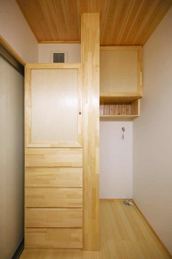お客様の下絵を元にカップボード、テレビボードを2つ、洗面台・洗面収納、ベッドなどたくさん造作家具を製作して各部屋に取り付けてあります。