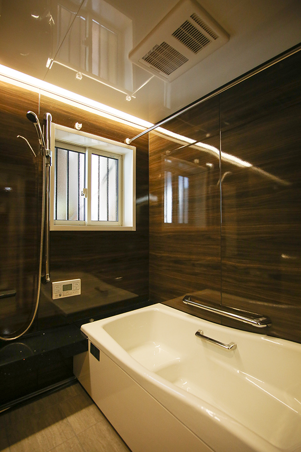 テレビボード上のウッドタイル、洗面台2つとタイル、NXトイレなどお客様のこだわりも散りばめてあります。
