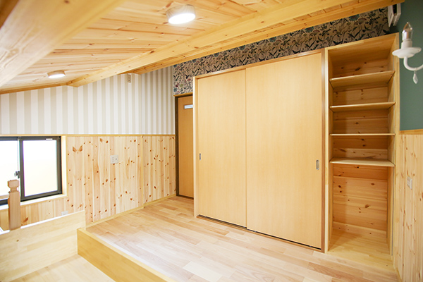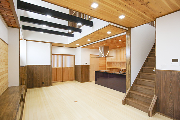 1階部分は、吹き抜けが欲しいとご依頼があり2階天井と床をめくり、丸太と梁が見えるようにしてあります。
