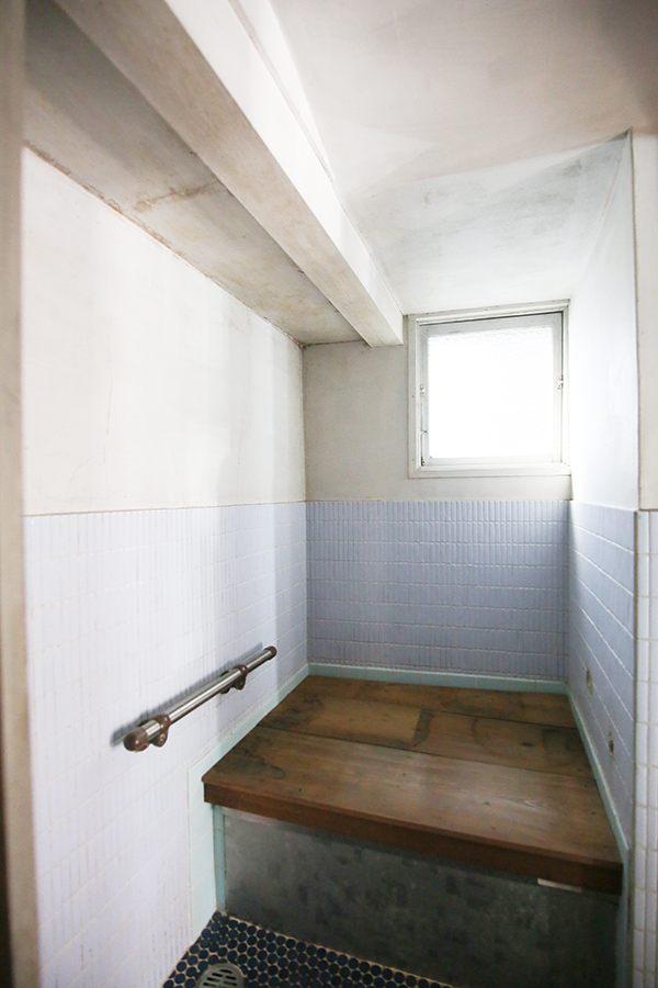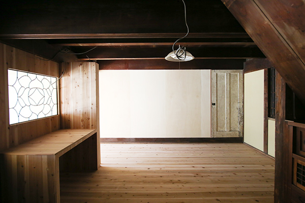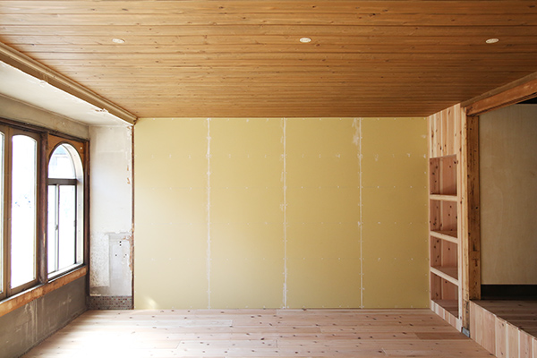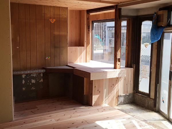 内観は、お風呂・トイレは触らず、天井・床を杉板で張り、収納・机を製作して取り付けました。