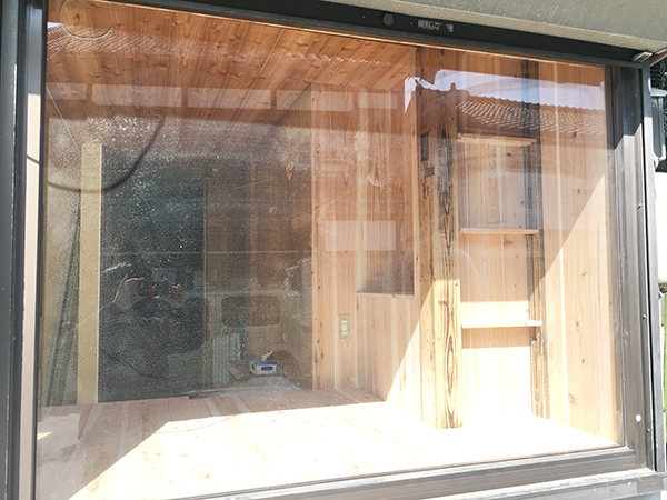 ショーケースも広くし、杉板で張り直し、こちらはお客様の手作りのステンドグラスをはめ込んでいます。