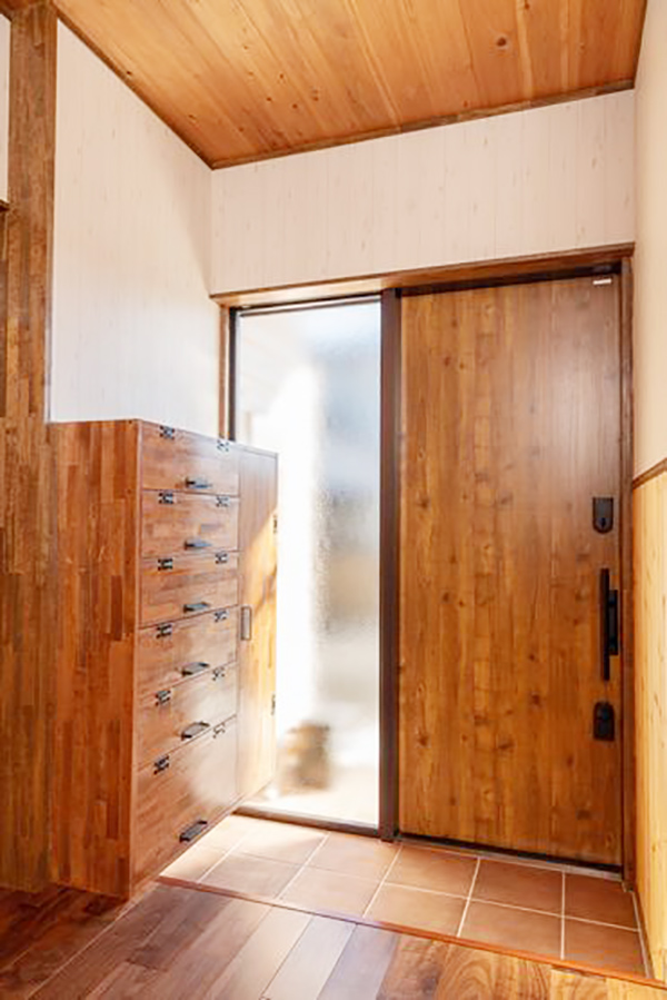 玄関を入ると、お客様の下絵を元に制作した取手を上に開けて履き物を入れる懐かしい下駄箱を制作して取り付けてあります。