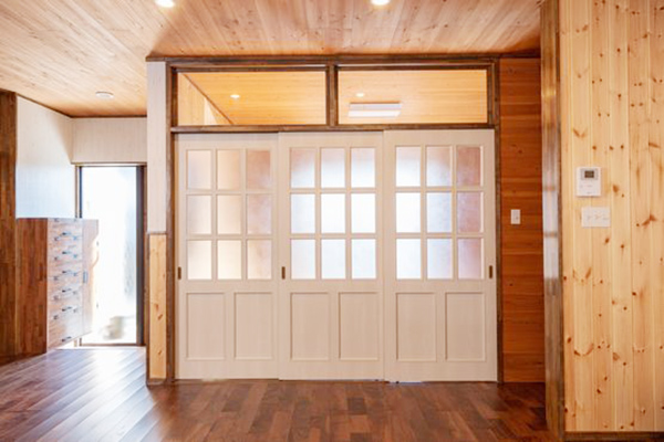寝室の片引戸には、大きなガラスをはめ込みガレージで愛車のポルシェが覗けるようにしました。