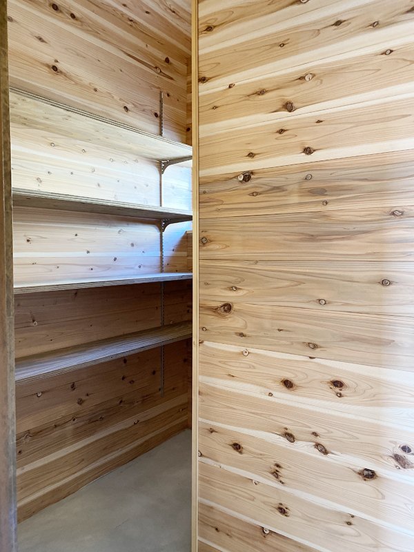 ケヤキの框、西南桜の床板、杉の天井と腰板、壁と天井を杉板で仕上げた土間収納・杉の網代で造った飾り棚など無垢材をふんだんに使用して仕上げてあります。