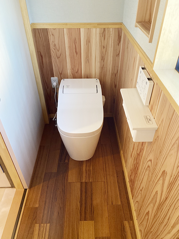 トイレは、格天井・杉の腰板・杉の収納と手洗い鉢で和室のような仕上がりになっています。