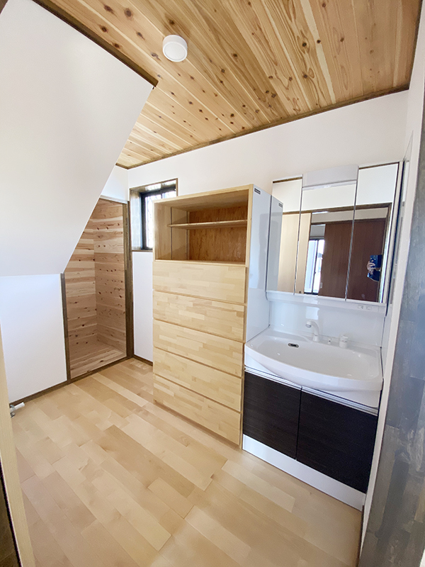 階段・風呂場を移動したので洗面所が広くなり、造作家具・洗面台を取り付けれて収納スペースを設けることができました。
