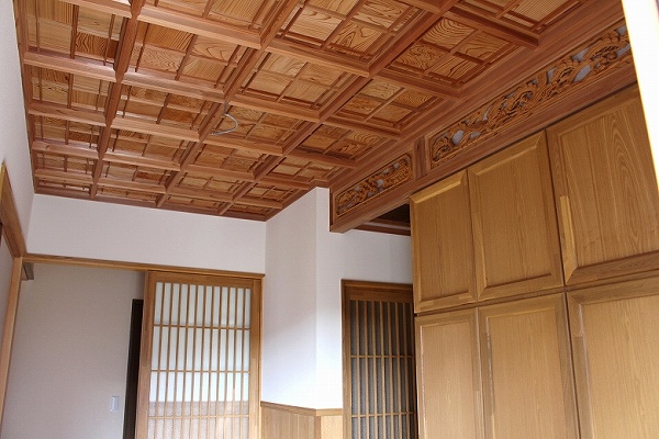 玄関入っての格天井、骨董の重箱のフタをはめ込んだトイレの天井、当社の十八番の技になります。