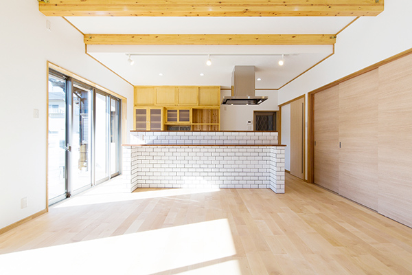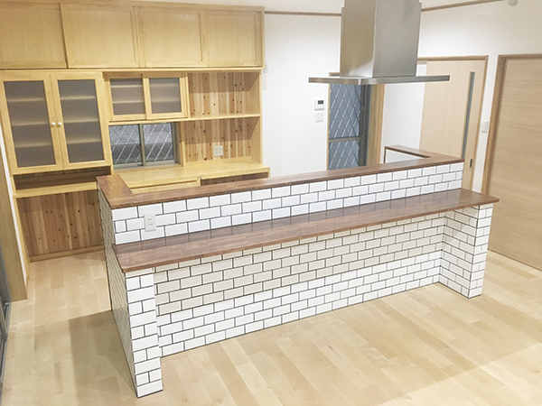 LDKは、奥様がこだわって選んだタイルをキッチンに合わせたカウンターを造り、左官屋さんに張ってもらいました。