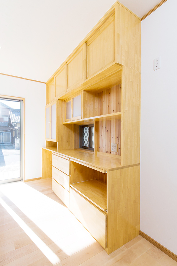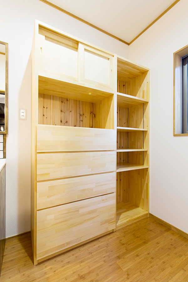また、キッチンで料理を作りながら小さなお子様が見えるように洋和室を隣接し、キッチン横には大きめなパントリーを設けました。