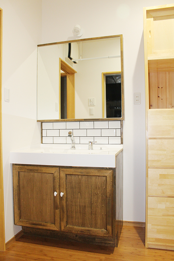カップボード・テレビボード・洗面台・洗面収納は、お客様の下絵を元に製作して取り付けました。