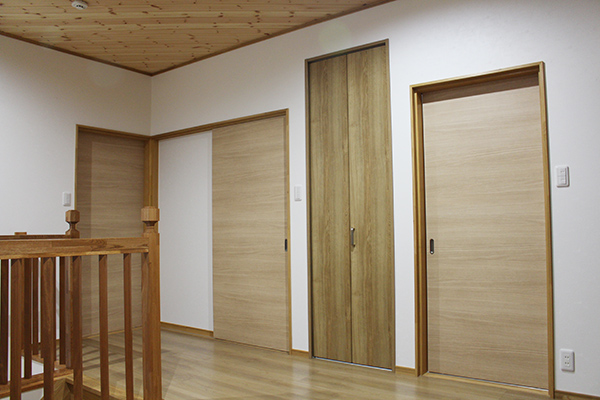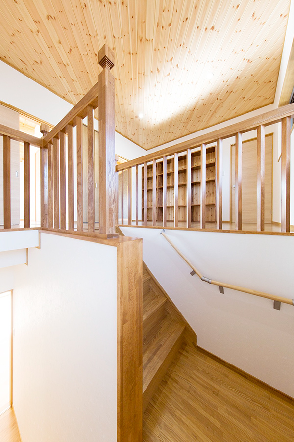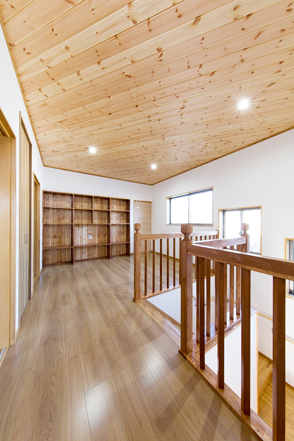 2階の階段を上がると大きなホールに本棚を取り付け、ご家族が団欒できるスペースにしてあり、寝室の奥にはウォークインクロゼットを設け、たくさん収納ができるようになっています。