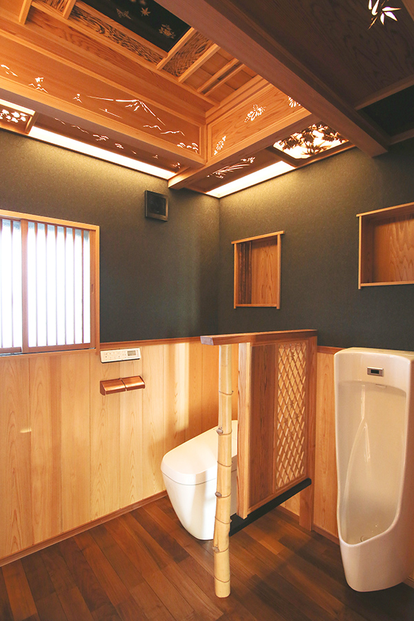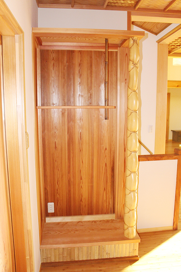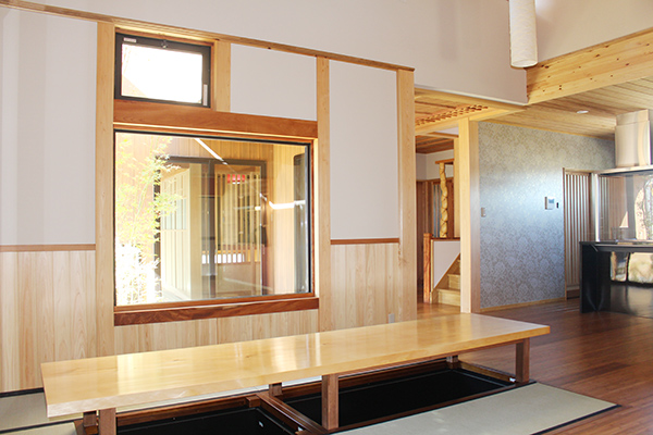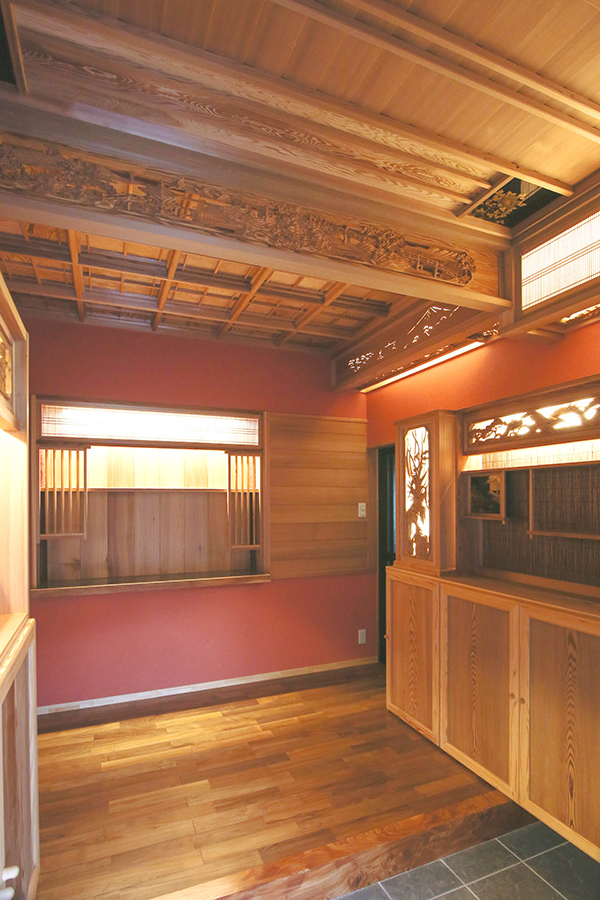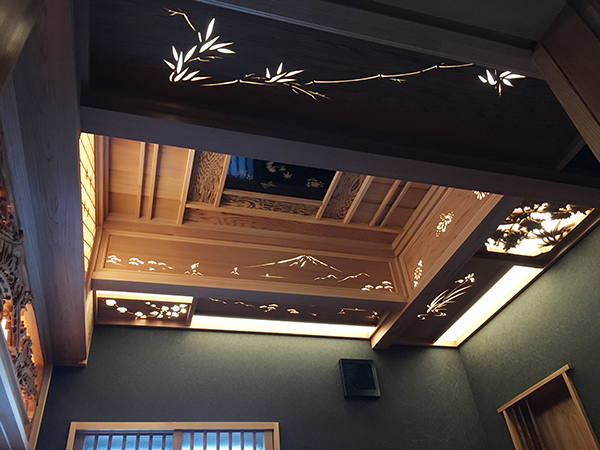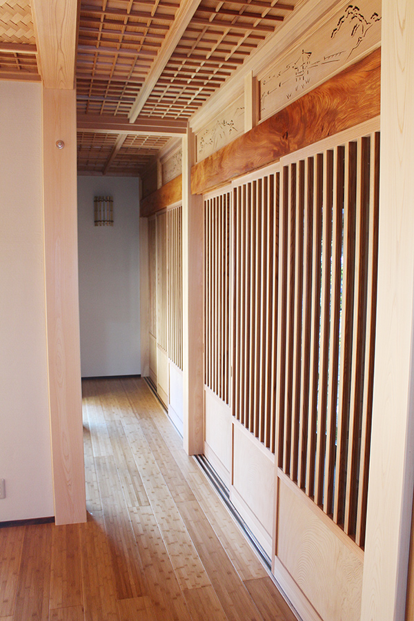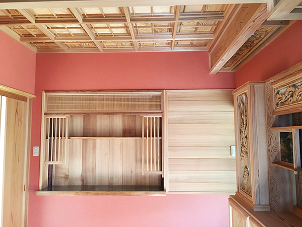 完成してお客様から『玄関・トイレの格天井と欄間、和室の天井と建具と凄い技ですよね。見ていて飽きないです。堀コタツの一枚板、竹の床・飾り棚もたまらないです!榎本建築さんと出会えて良かったです。想像以上です!』と言って頂けました。