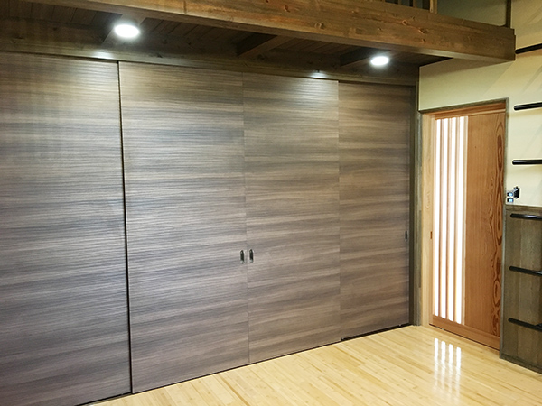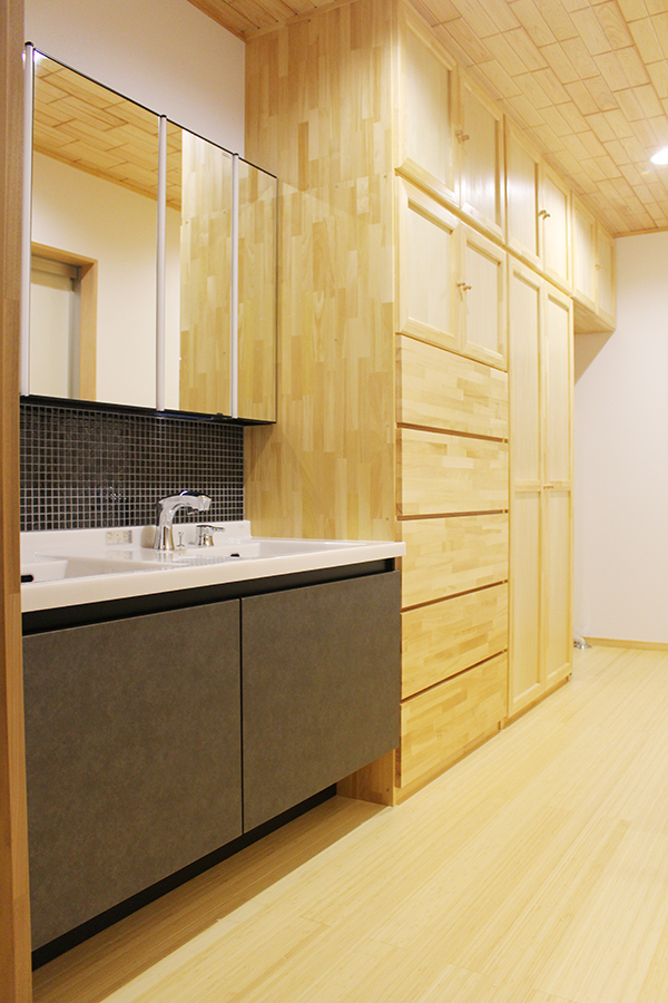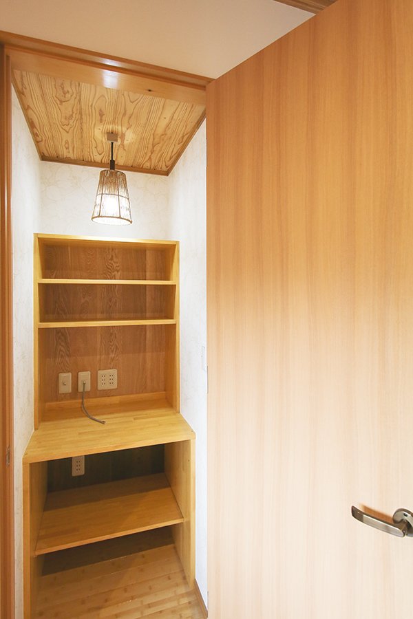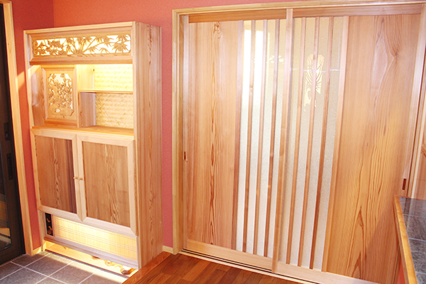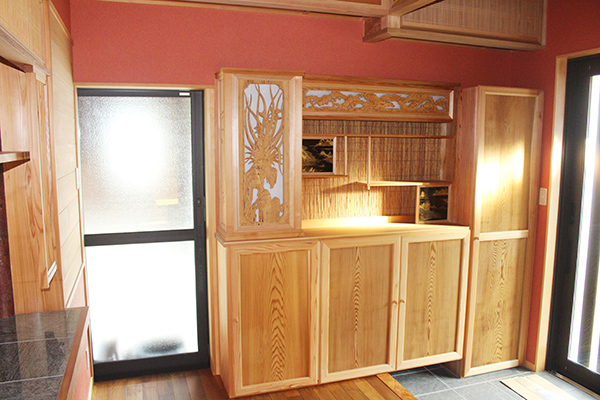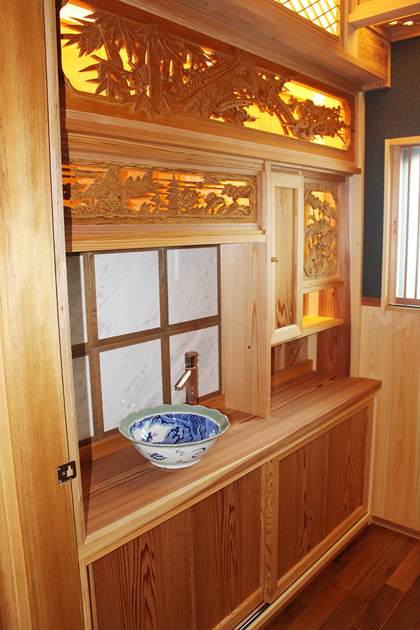 収納は、杉の一枚板を使って製作した下駄箱、竹と杉で製作した飾り棚を2ヶ所、明治時代の伊万里焼きの手洗い鉢を取り付けたトイレ収納、お客様の下絵を元に製作したカップポード・テレビボード・洗面収納などたくさん取り付けました。