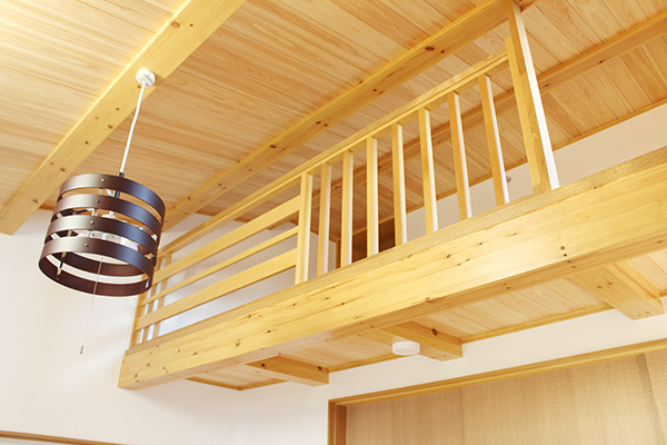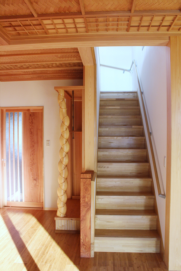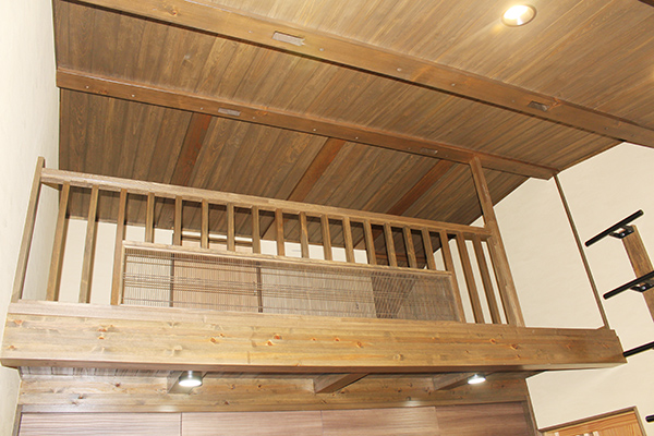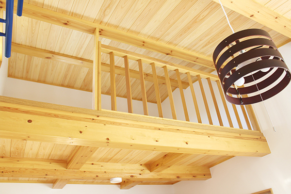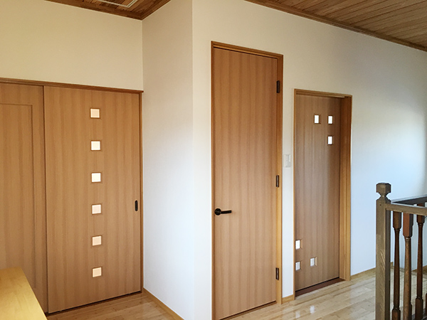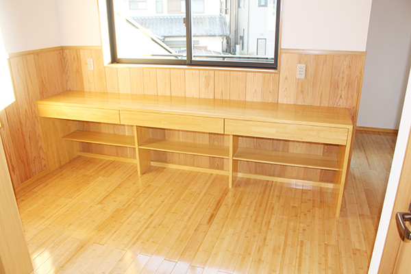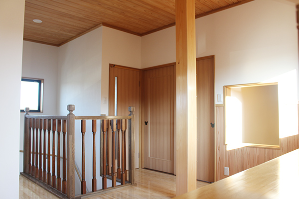 2階はホールにお子さん3人が座って勉強できる机を取り付け、横の壁に開口を造り居間を覗けるようにしてあります。