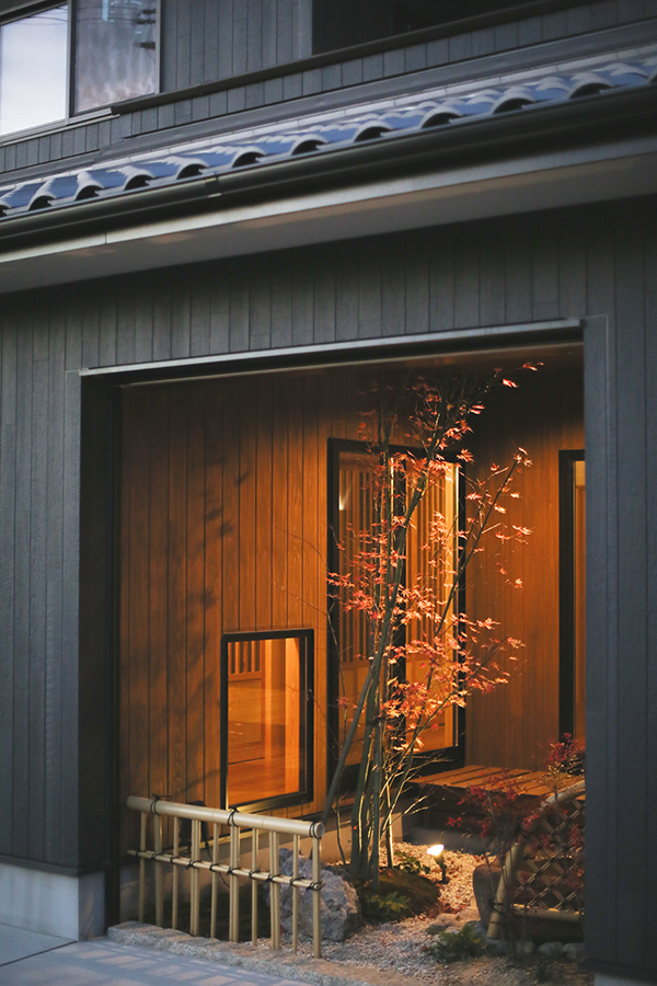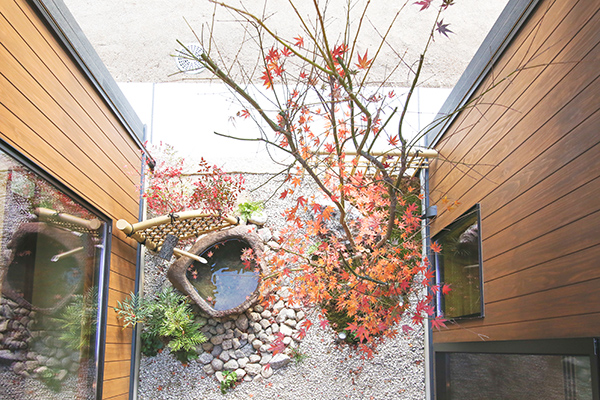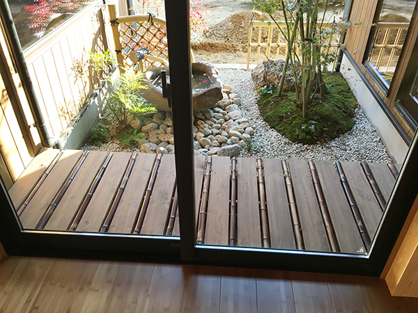 中庭は、煤竹で製作した腰掛けを取り付け、お客様のご希望の紅葉を植え、水鉢・石と苔で庭師さんに製作してもらいました。