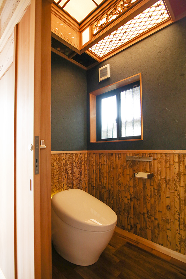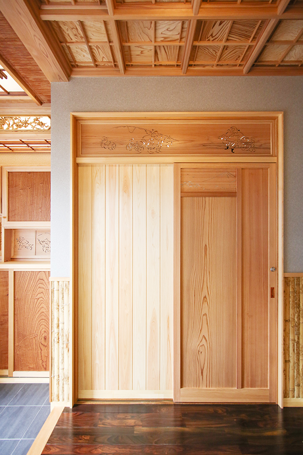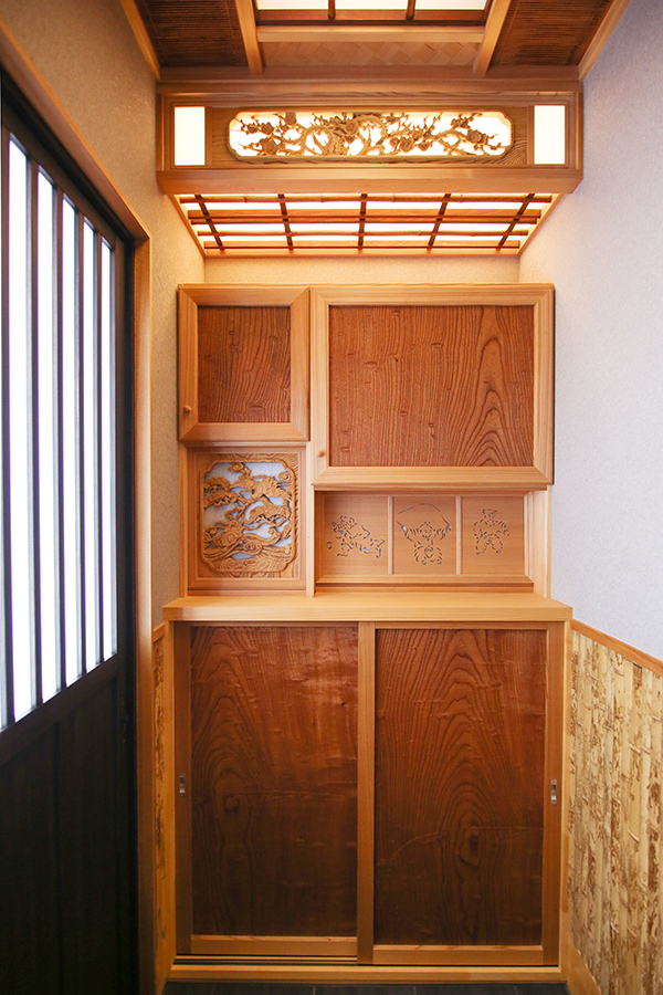 玄関・トイレ収納は、お任せということで、杉と欄間で製作させて頂きました。
