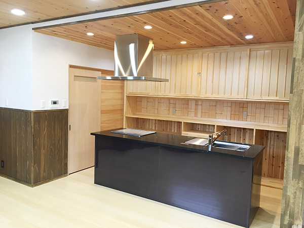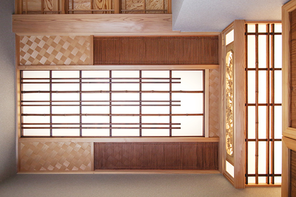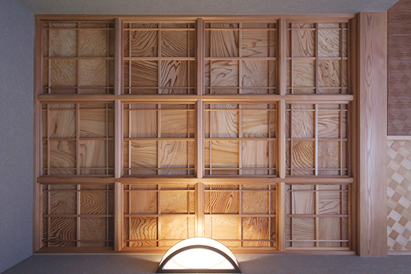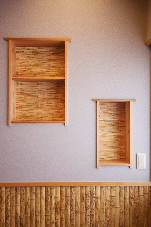 は、杉・欅・竹・欄間・古民家の建具などを細工をして取り付けてあります。