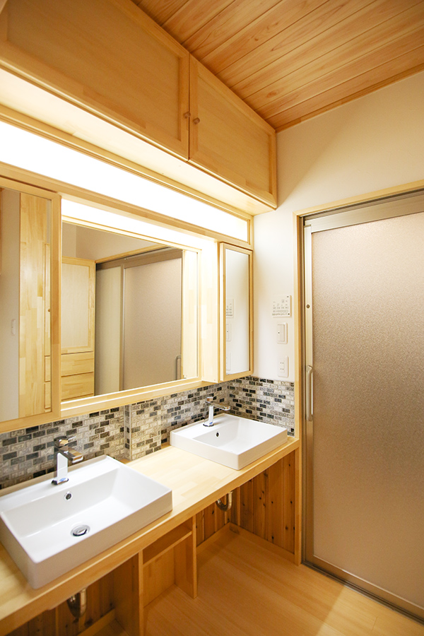 テレビボード上のウッドタイル、洗面台2つとタイル、NXトイレなどお客様のこだわりも散りばめてあります。