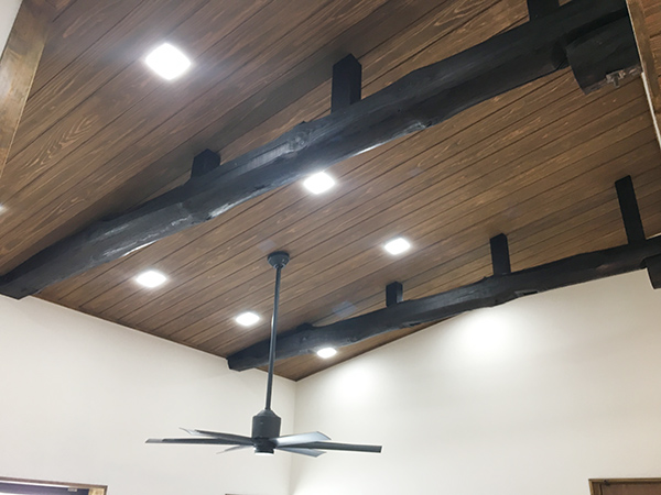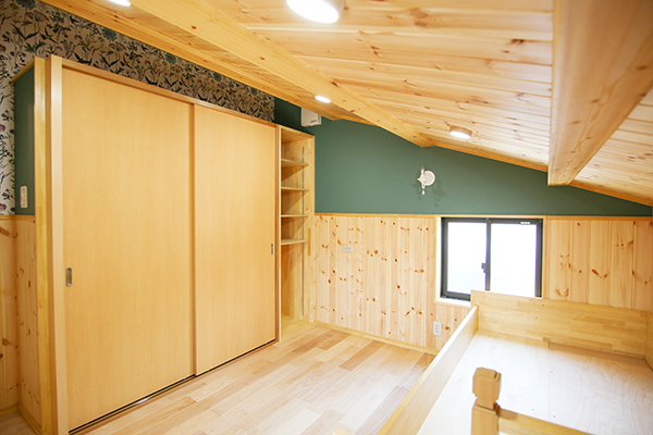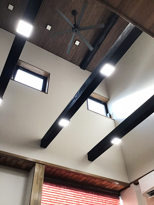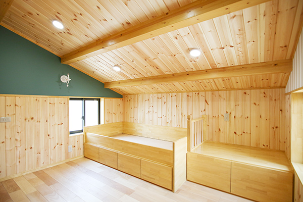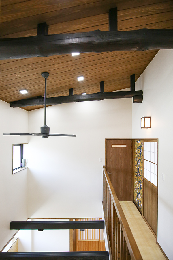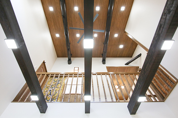 1階部分は、吹き抜けが欲しいとご依頼があり2階天井と床をめくり、丸太と梁が見えるようにしてあります。